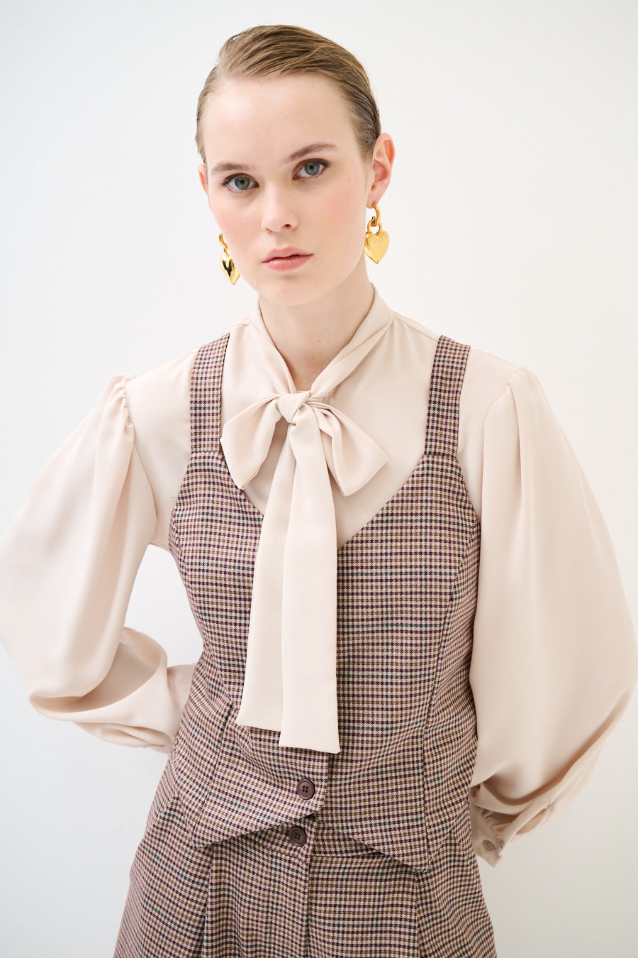 DESCRIZIONE: Gilet crop pied de poule con chiusura a tre bottoni con spalline sottili e incrociati sulla schiena.