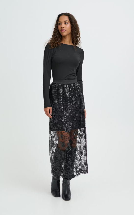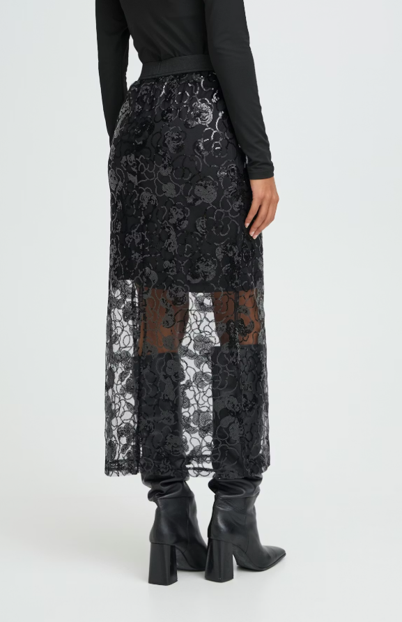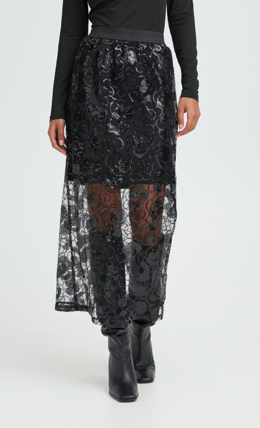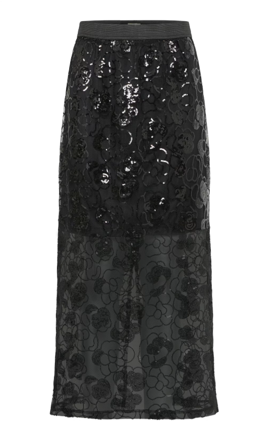 DESCRIZIONE: gonna midi trasparente in tulle con applicazioni in paillettes e sottogonna.