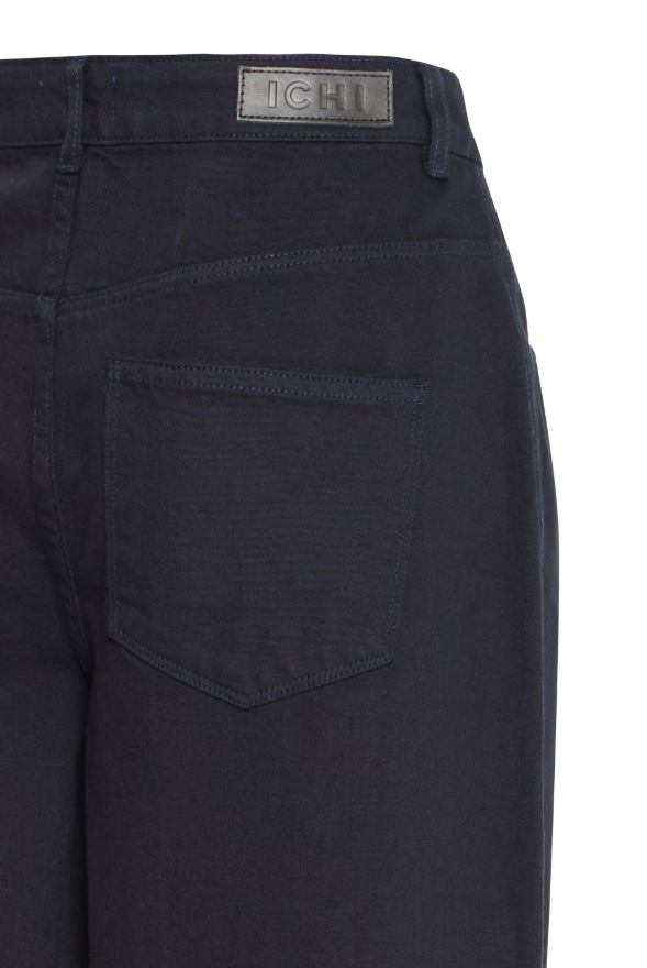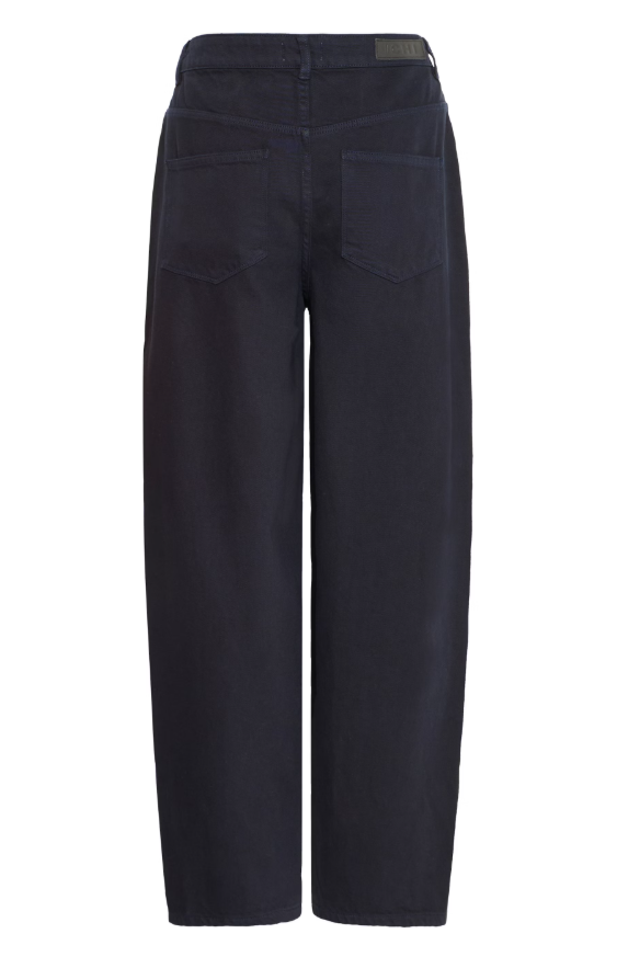 DESCRIZIONE PRODOTTO: Pantalone in tela denim blu navy dallo stile Giappo con vita alta e forma ad arco baggy con cucitura laterale visibile.