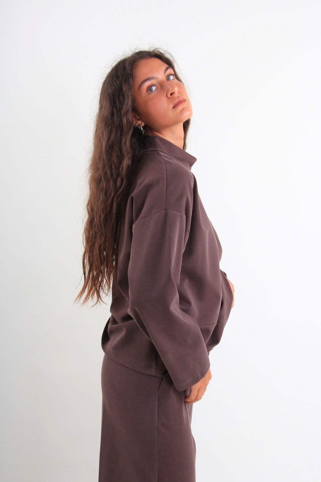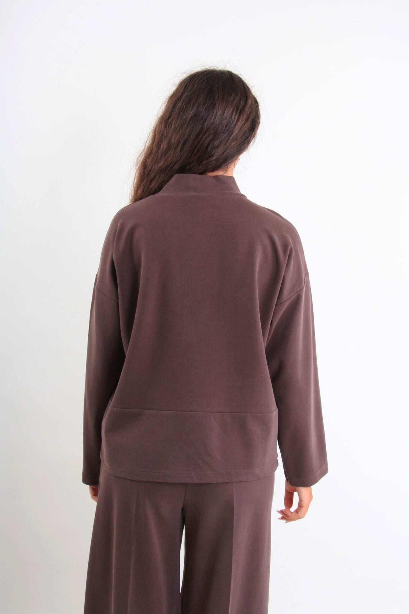 DESCRIZIONE PRODOTTO: Maglia di felpa realizzata in tessuto tecnico leggero e confortevole, ideale per la mezza stagione o per completare look casual e curati. Il collo morbido, dalla linea leggermente strutturata, aggiunge carattere al capo senza rinunciare alla praticità. La vestibilità è ampia ma ben bilanciata, con spalle scese e maniche lunghe per un comfort quotidiano. Perfetta da indossare con pantaloni coordinati o jeans per un outfit rilassato ma attento ai dettagli.